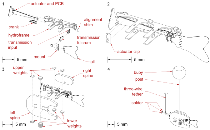 Abstract: Countless underwater robots seek to monitor aquatic environments while minimizing their impact on fragile ecosystems. At mm-scales, these systems can be used in a range of waterways, from shallow streams and rivers, to larger ponds and lakes, and navigate around large obstacles or through tight spaces in coral reefs, mangroves, or pipe systems. They can also be more readily used as platforms for biological study, as small-scale robots can more easily be integrated into bench-top characterization systems to verify hydrodynamic performance. Here, we present a new robotic platform, the Daniobot, a 16.5 mm body length (BL) microrobotic fish that is capable of achieving top speeds of 2.84 BL/s. At 23.8 mm total length (TL), Daniobot is, to the best of our knowledge, the smallest fish-inspired robot propelled by onboard actuators. We present the design, fabrication, and assembly of this robot as well as detailed position and velocity results at varying tail amplitudes and frequencies, and compare their trends to a simple analytical model. This design uses a single PZT bimorph actuator operating at 175 V, enabling future untethered experiments.