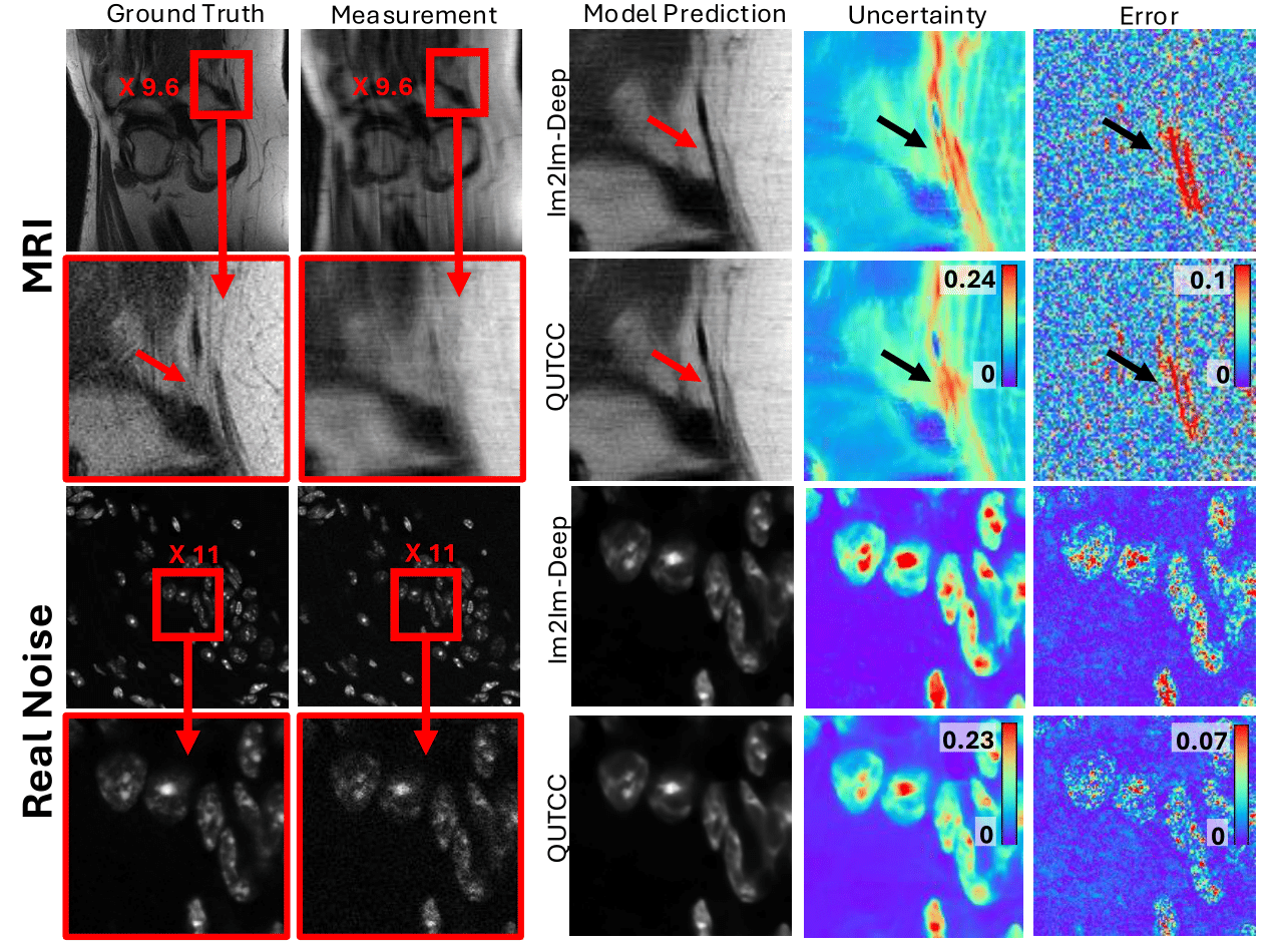 Abstract: Deep learning models often hallucinate, producing realistic artifacts that are not truly present in the sample. This can have dire consequences for scientific and medical inverse problems, such as MRI and microscopy denoising, where accuracy is more important than perceptual quality. Uncertainty quantification techniques, such as conformal prediction, can pinpoint outliers and provide guarantees for image regression tasks, improving reliability. However, existing methods utilize a linear constant scaling factor to calibrate uncertainty bounds, resulting in larger, less informative bounds. We propose QUTCC, a quantile uncertainty training and calibration technique that enables nonlinear, non-uniform scaling of quantile predictions to enable tighter uncertainty estimates. Using a U-Net architecture with a quantile embedding, QUTCC enables the prediction of the full conditional distribution of quantiles for the imaging task. During calibration, QUTCC generates uncertainty bounds by iteratively querying the network for upper and lower quantiles, progressively refining the bounds to obtain a tighter interval that captures the desired coverage. We evaluate our method on several denoising tasks as well as compressive MRI reconstruction. Our method successfully pinpoints hallucinations in image estimates and consistently achieves tighter uncertainty intervals than prior methods while maintaining the same statistical coverage.