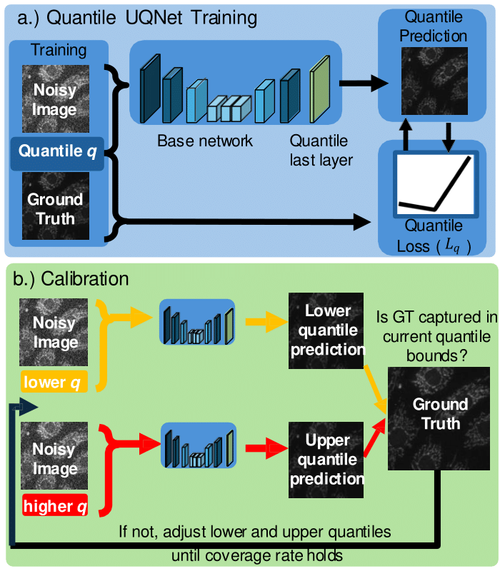 Abstract: Deep learning models hallucinate and for scientific applications such as biomedical image denoising, predictions that deviate from the ground truth can have catastrophic downstream effects. Uncertainty quantification techniques can improve the reliability of deep learning models by detecting hallucinations and improving prediction confidence. We propose Quantile UQNet, a conformal network that provides a more accurate estimate of uncertainty than previous networks. To achieve this, our model applies a nonlinear scaling to its predictions, ensuring a tighter and more reliable bound on uncertainty estimates. We test this network on Gaussian image denoising and demonstrate its ability to provide meaningful uncertainty predictions that are independent of the signal in the sample. Compared to the method introduced in Image-to-Image regression, our model consistently achieves better denoising performance and smaller uncertainty intervals, while maintaining the same statistical coverage.